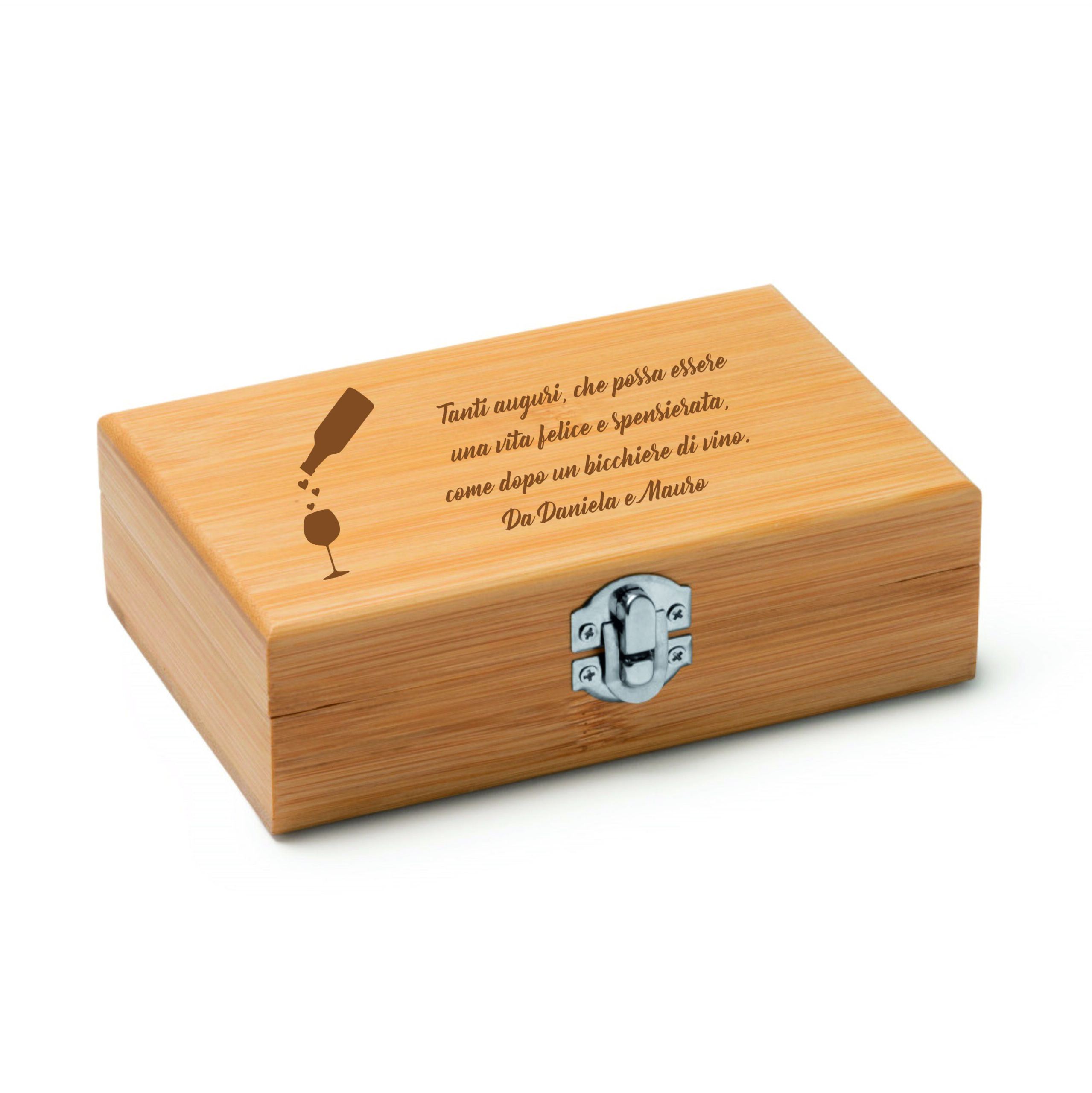 Unirete un regalo unico e che fa sempre comodo per aprire una buona bottiglia di vino, con un regalo personalizzato e pieno di amore. Gli accessori infatti sono contenuti in un bellissimo cofanetto in bamboo con imbottitura, personalizzabile con una dedica, un augurio o i nomi.