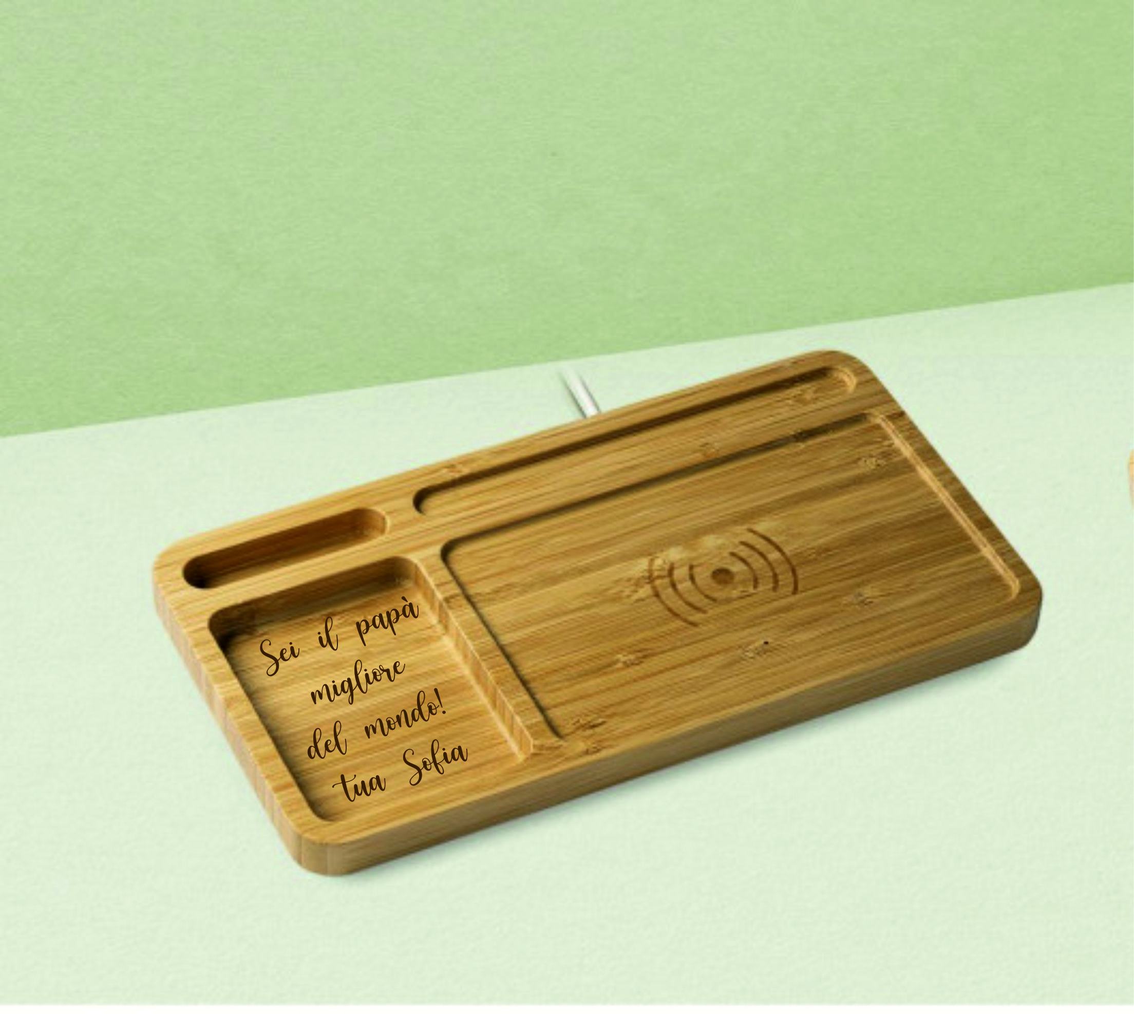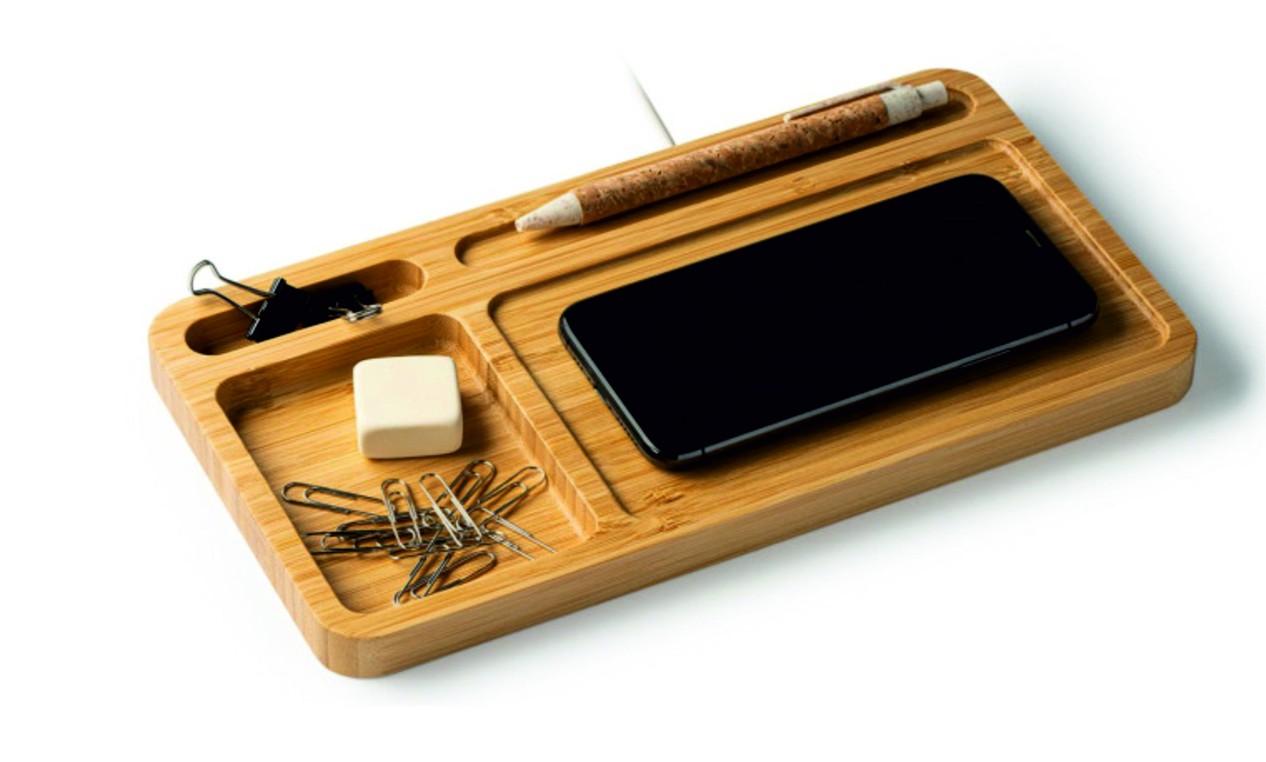 Realizzato in bamboo naturale con caricatore integrato nel vassoio organizer. Compatibile con i modelli con tecnologia di ricarica wireless. 5W. Cavo bianco incluso. Dimensioni: 27 x 1,5 x 14,5 cm4